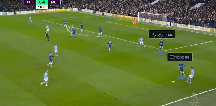 Задумка Гвардиолы состояла в том, что Жоау Канселу, который вышел чуть ли не правым вингером, должен был вытягивать Марка Кукурелью. Тогда зону за спиной испанца атаковали бы другие игроки «Сити» – например, Кевин де Брюйне.
