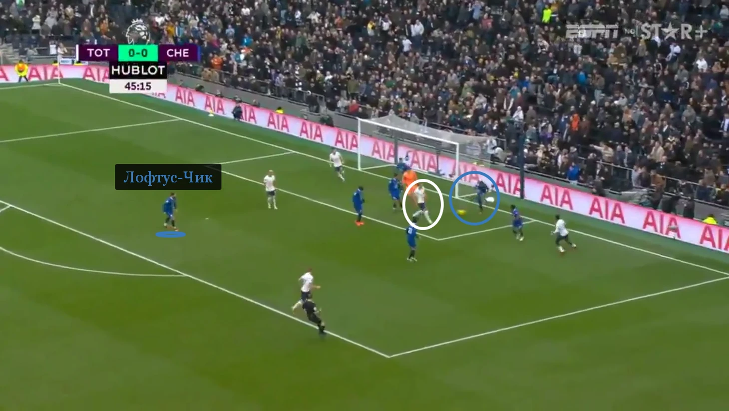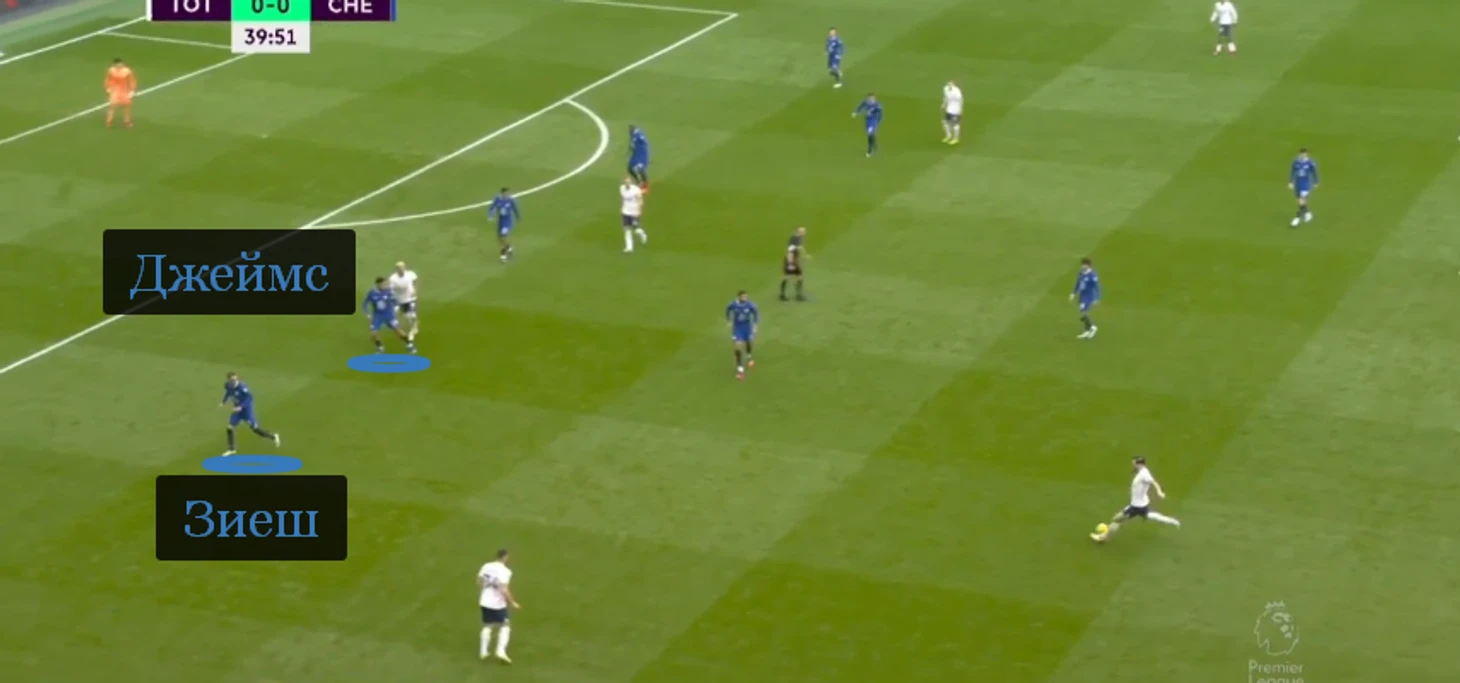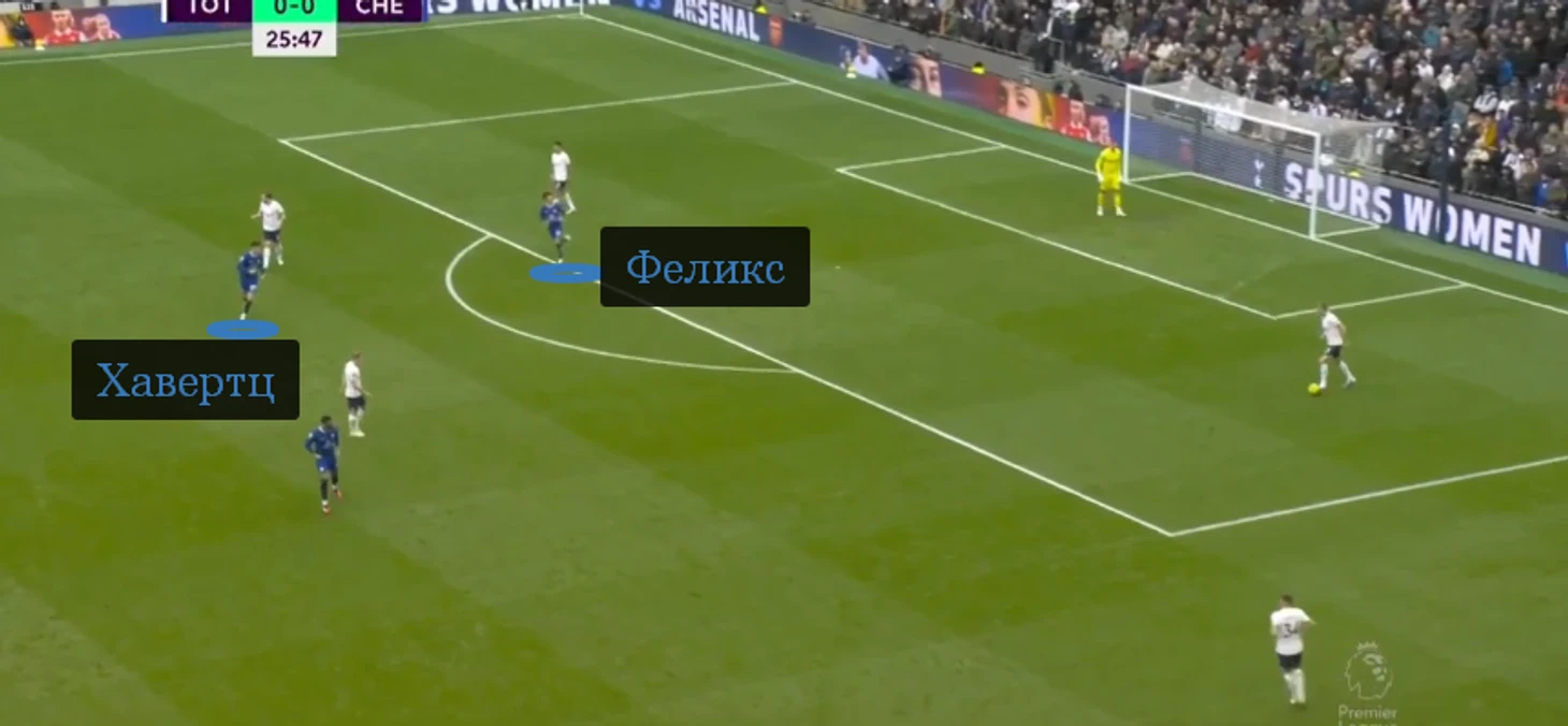Один из игроков тройки ротировался с Каем Хавертцем, чтобы поддавливать чужих центральных защитников. «Челси» мешал и первой, и средней линии «Тоттенхэма», что в первом тайме вместе с контрпрессингом вылилось в пять потерь хозяев на домашней половине.