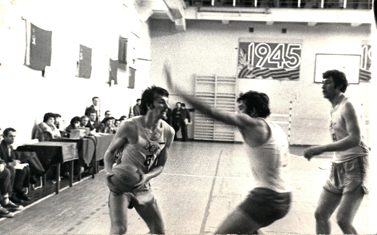 Матч на первенство РСФСР–1967 года в Перми. По кольцу бросает Игорь Скрипкин. На подборе (в темной форме) — Анатолий Сологуб (худенький и высокий паренек) и Александр Меняев (№8)