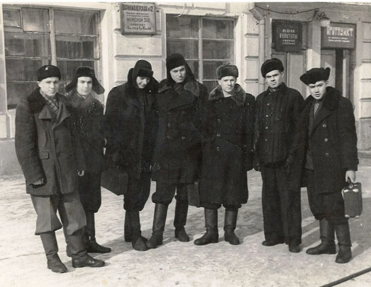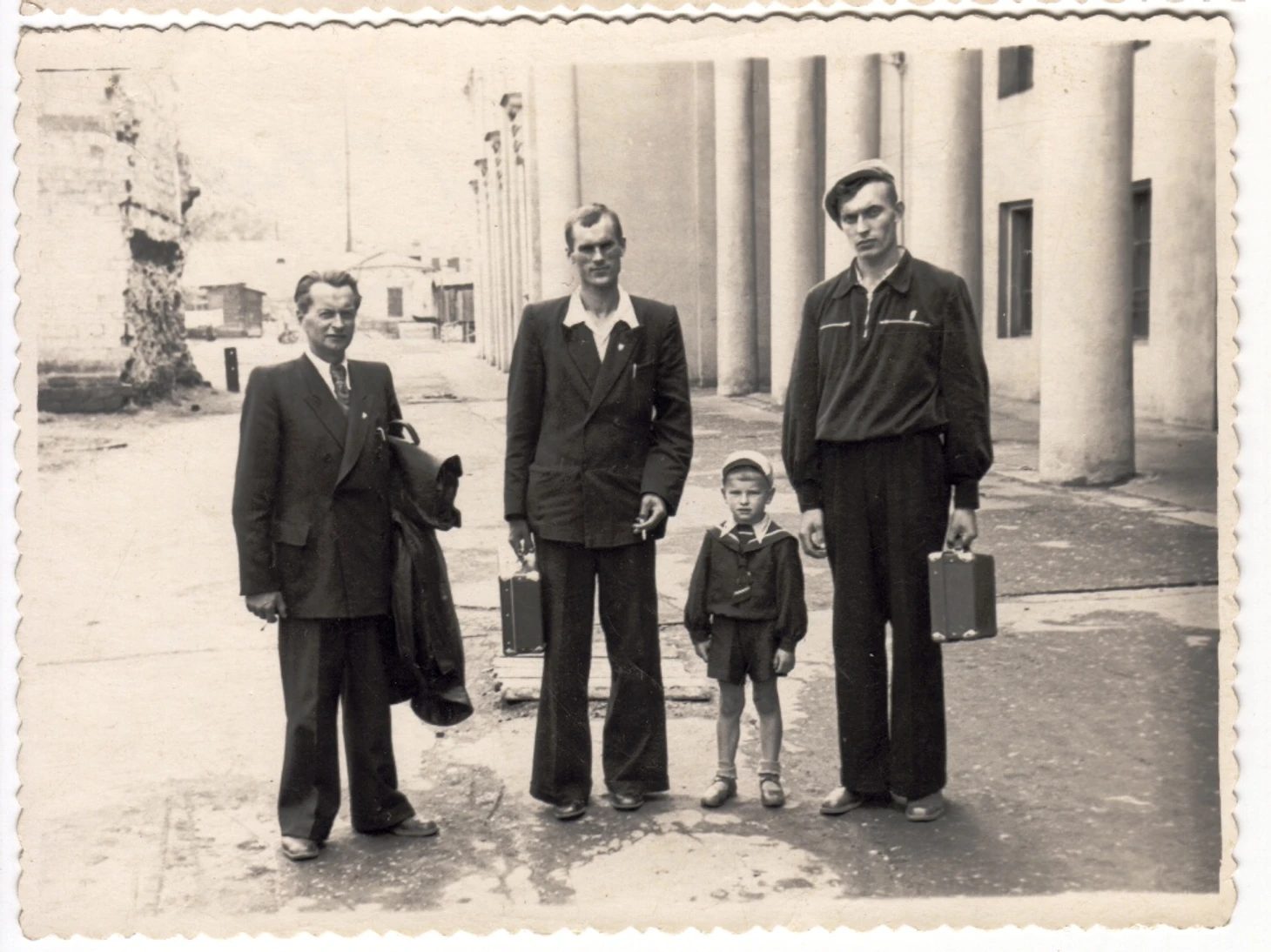 Западная трибуна стадиона «Труд». 1955 год. Слева направо: Петрас Валюшайтис, Виктор Чуешев, Римас Валюшайтис, Михаил Мишуков