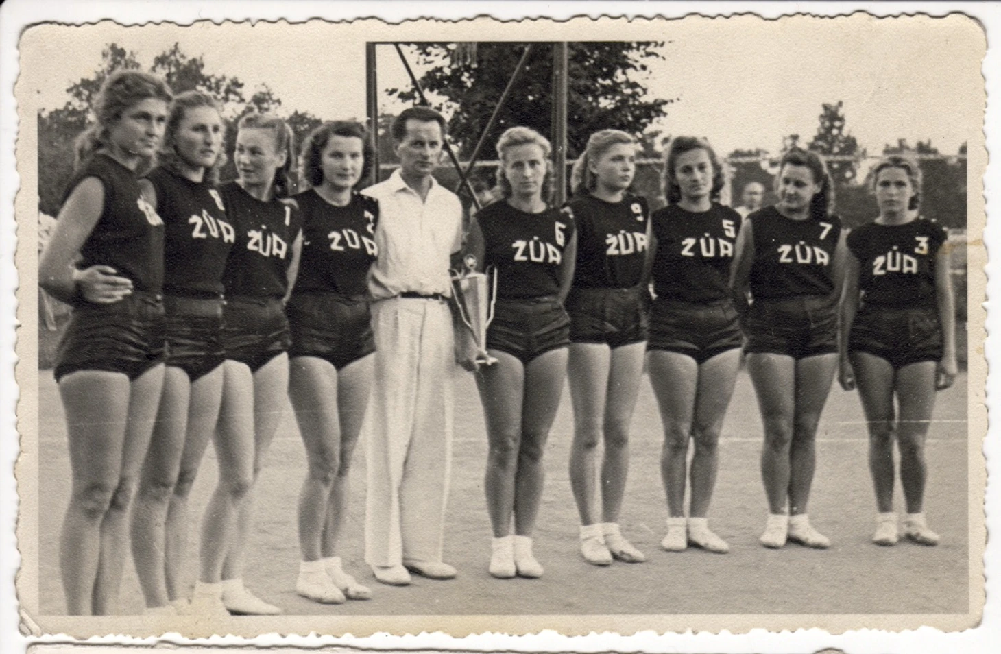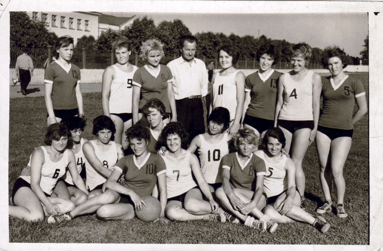 Женская команда «Шахтер» (Черемхово) на своем стадионе. 1965 год. В первом ряду третья справа Тоня Лю Фа, седьмая – Вика Уварова. В центре — Петрас Валюшайтис