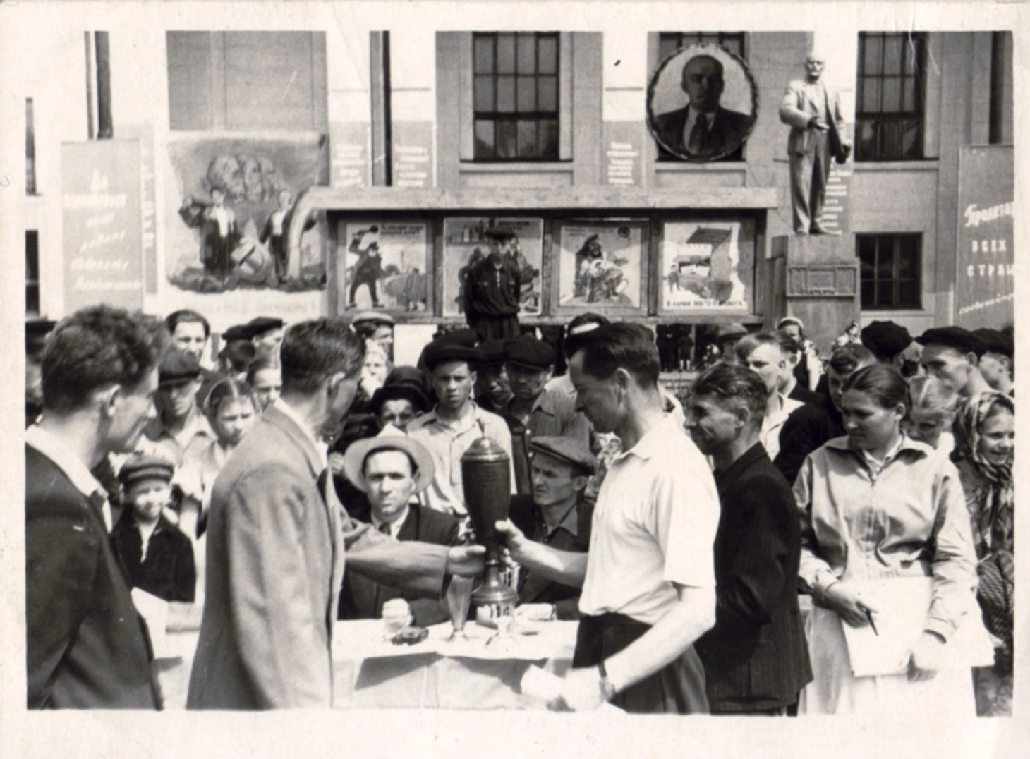 Петрас Валюшайтис с очередным Кубком в День шахтера у Дома культуры на Первомайской улице