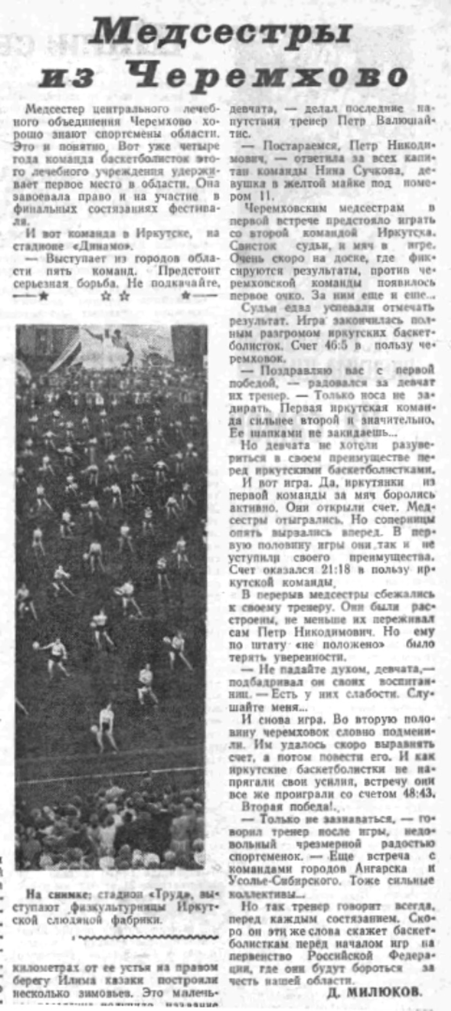Заметка в газете «Советская молодежь» (№136, 6 июля 1960) о черемховской женской баскетбольной команде