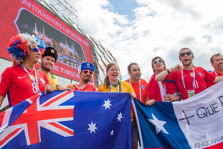 Болельщикам сборных Чили и Австралии не позавидуешь. Из родных городов до Москвы на решающий матч группового этапа им пришлось добираться на перекладных: сначала лететь самолетом до Европы, а затем по ходу турнира ехать на поезде в столицу из Казани и Петербурга.