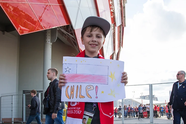 Весь турнир по городам Кубка конфедераций ходит байка про 15 тысяч прилетевших в Россию чилийцев, и на матчах их сборной это, наконец, похоже на правду. Парни в сине-бело-красных ушанках и ярких майках оккупируют все палатки с пивом, лениво едят на солнце мороженное и с удовольствием фотографируются со всеми желающими.