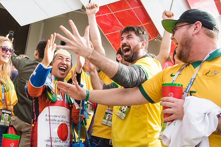 Оригинальные австралийцы гордятся тем, что увидят сотый матч Тима Кэйхилла в составе сборной, разрешают всем сфотографироваться с надувным кенгуру, поют «Мы чемпионы Азии!» и братаются с неожиданно появившимися на стадионе японцами. Сборные от азиатской конфедерации футбола должны держаться вместе.
