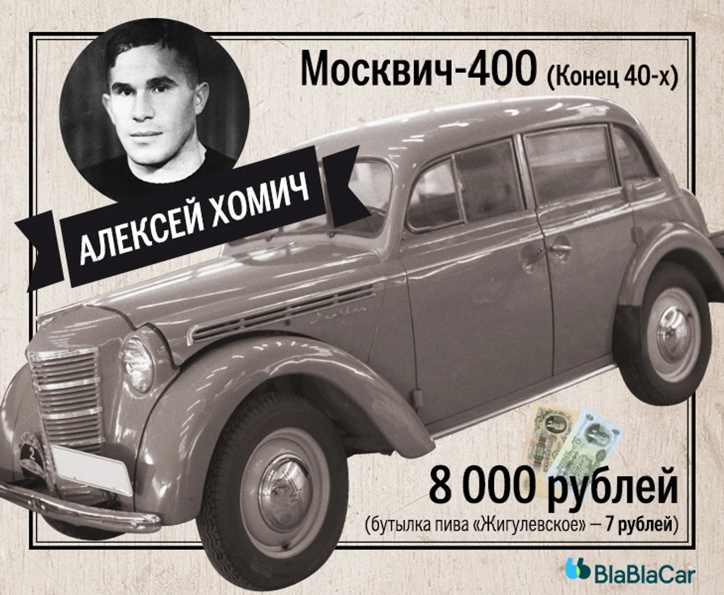После поездки в Англию в 1945 году, где англичане дали ему прозвище «Тигр», Хомич первым в московском «Динамо» купил машину – «Москвич-400» (производился с 1946-го по 1954-й, 8000 рублей, разгонялся до 90 км/ч), совсем маленькую старенькую машинку, содранную с трофейного немецкого «Опель Кадет», на таких ездили фашисты в фильмах про войну. В отличие от немца, «Москвич» был четырехдверным – причем благодаря Сталину. Проверяя машину, он сел рядом с водителем и попросил конструктора пройти на заднее сиденье. Для этого Сталину пришлось бы выйти из машины – так и появились две дополнительные двери.