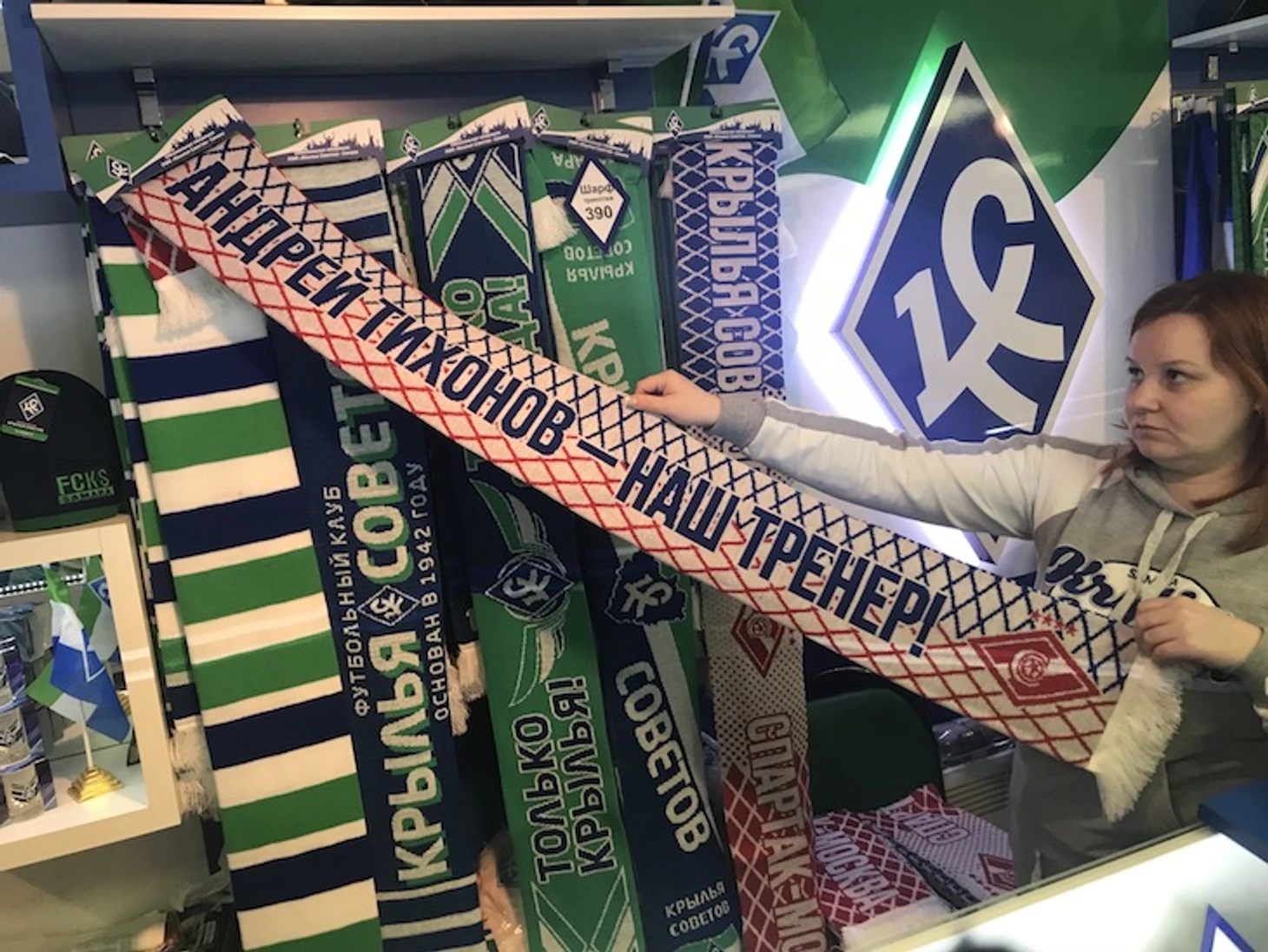 На стадионе еще лучше – гремит летняя испанская музыка, фанаты «Спартака» танцуют, повсюду культ Андрея Тихонова. И местные, и спартаковцы покупают стильные матчевые шарфы: с одной стороны – «Крылья» против «Спартака»; с другой – «Андрей Тихонов – наш тренер» и обе эмблемы; к матчу подготовили вымпелы, кружки, магниты с концептом «Одна легенда. Два клуба».