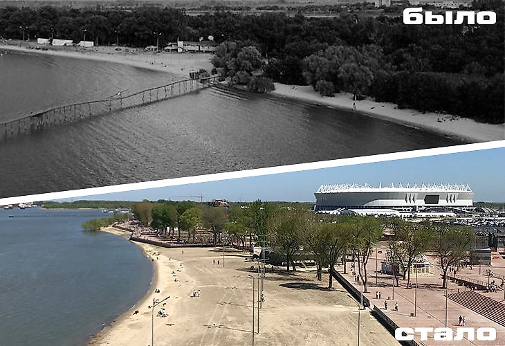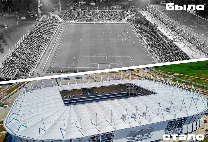 Стало: «Ростов-Арена», 37 868 зрителей (45 тысяч для ЧМ), вид с Дона, треугольные мачты отсылают к Олимпийскому стадиону в Лондоне.