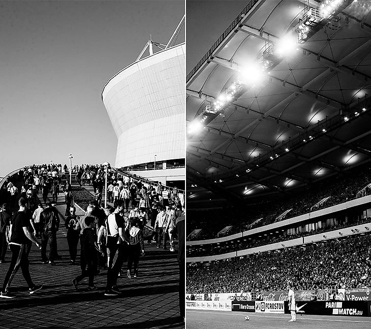 – Безусловно. Сам стадион очень фотогеничный, абсолютно со всех сторон. Он практически сам все делает за тебя. Там очень красивый пандус, по-которому люди восходят к чаше и превращаются в силуэты. Внутри – светлая крыша, легкий фасад, на который очень мягко ложится предзакатное солнце. А вечером еще и появляются свои собственные огни. Ко всему этому еще и идеальная погода. Дон. Конечно, кайф. Просто наслаждайся.