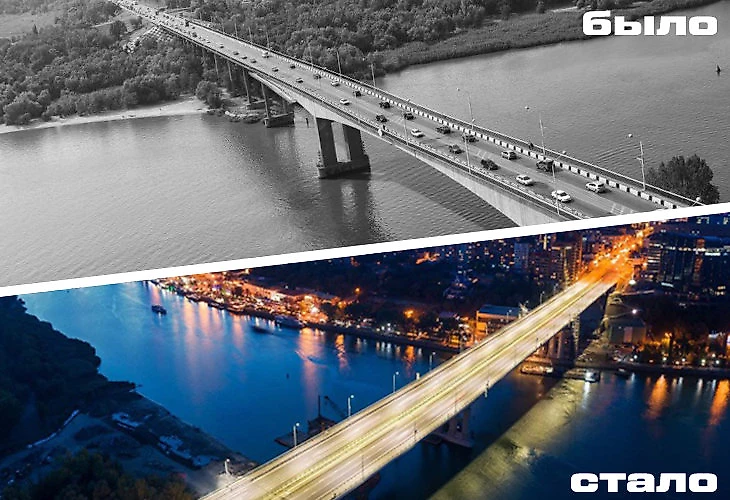Было: рушился и закрывался на ремонт, низкая пропускная способность (45 тысяч машин в сутки), сложно добраться на другой берег без автомобиля или велосипеда, светили обычные фонари.