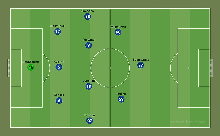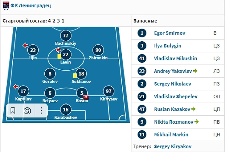 Схема и стартовый состав. Стартовый состав «Ленинградца» в первых трёх турах практически не менялся, однако менялась схема. В первой игре команда играла по схеме 4-2-3-1 (скриншот ниже).