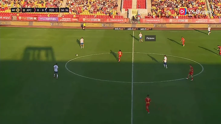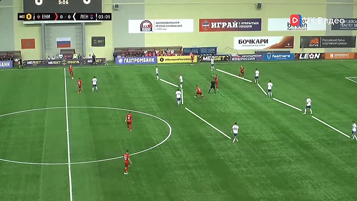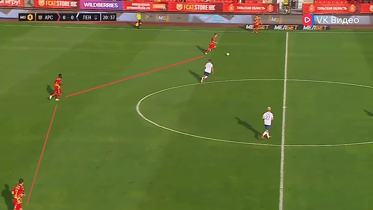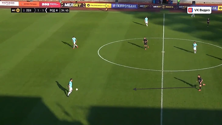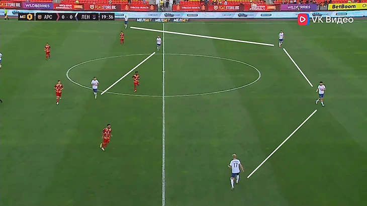 Билд-ап. Неизменна в этой фазе у «Ленинградца» одна вещь - сдвоенная опорная зона. Начнём с первого тура, где команда играла по схеме 4-2-3-1. Здесь не было каких-то тактических инноваций. Крайние защитники использовали ширину поля, опорники помогали линии обороны выходить преодолевать прессинг соперника. Иногда можно было увидеть, как крайний защитник шёл выше, а опорник занимал его место. «Десяткой» и неким свободным художником в этой игре был Максим Левин. Он частенько спускался довольно глубоко в поисках мяча, предлагал себя в пространстве между линиями. В общем, всячески помогал команде развивать атаки и не имел чёткой позиции на поле. Два других атакующих полузащитника располагались выше и находилось под форвардом. Фланги эти игроки освобождали для открываний крайних защитников. Схему иногда можно было «рисовать» как 4-3-2-1. Голкипер «Ленинградца» предпочитал выносить мяч и не стремился как-либо задействовать линию обороны. Владение мячом зачастую происходило на своей половине или в центре поля, и оно составило по итогу матча 58%.