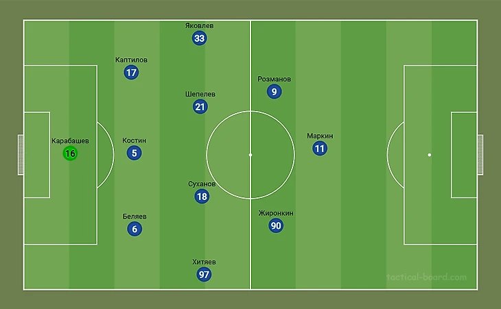 В следующих трёх турах главный тренер команды прибегнул к формации 5-4-1. В матче с «Енисеем» и «Родиной» состав был один и тот же, а вот с «Тюменью» произошли следующие изменения: Шепелев (21) занял место Горулёва (8) в центре поля, на месте левого инсайда появился Розманов (9), а на острие атаки вышел Маркин (11).
