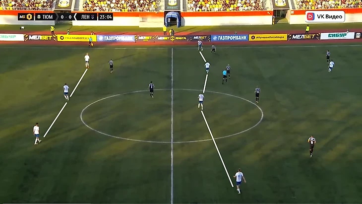 Теперь обратимся к билд-апу в формации 5-4-1, по которой коллектив Сергея Крьякова играл в следующих трёх турах. В играх с «Енисеем» и «Родиной» «Ленинградец» часто прибегал к длинным передачам. Центральные защитники и вратарь практически всегда старались сразу же отправить мяч верхом вперёд либо на форварда, либо во фланг. Процент владения мячом с «Енисеем» был 30%, а с «Родиной» 35%. В игре с «Тюменью» команда владела мяча больше и старалась не так часто поднимать мяч, однако тенденция c длинными верховыми передачами сохранялась. Билд-ап осуществлялся по схеме 3-2. Если же кто-то из тройки центральных защитников хотел развить атаку низом, то зачастую прибегал к варианту с передачей латералю, которые создавали ширину. Нельзя не отметить, что игроки «Тюмени» очень качественно перекрывали варианты передач через центр. Даже когда «Ленинградцу» нужно было забирать мяч и обдуманно конструировать атаки, чтобы отыгрываться, они всё равно прибегали к верховым передачам. В втором тайме произошли перестановки и можно было вновь наблюдать схему 4-2-3-1 и, соответственно, билд-ап 4-2 с той же ролью Левина в роле десятки, о которой мы говорили выше.