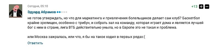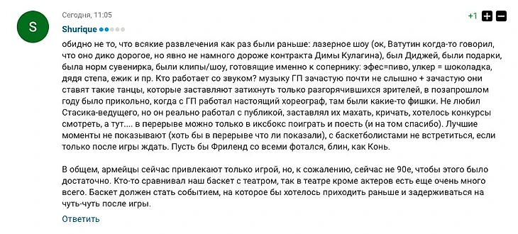 Трибуны же обновили в этом сезоне, но почему они не подходят этой арене? Первые 4-5 рядов – там никто не хочет сидеть, там ничего не видно. Ты просто создал «зону отчуждения» вокруг паркета, в которую не заходят даже маскоты с чирлидерами. Там свищет ветер…