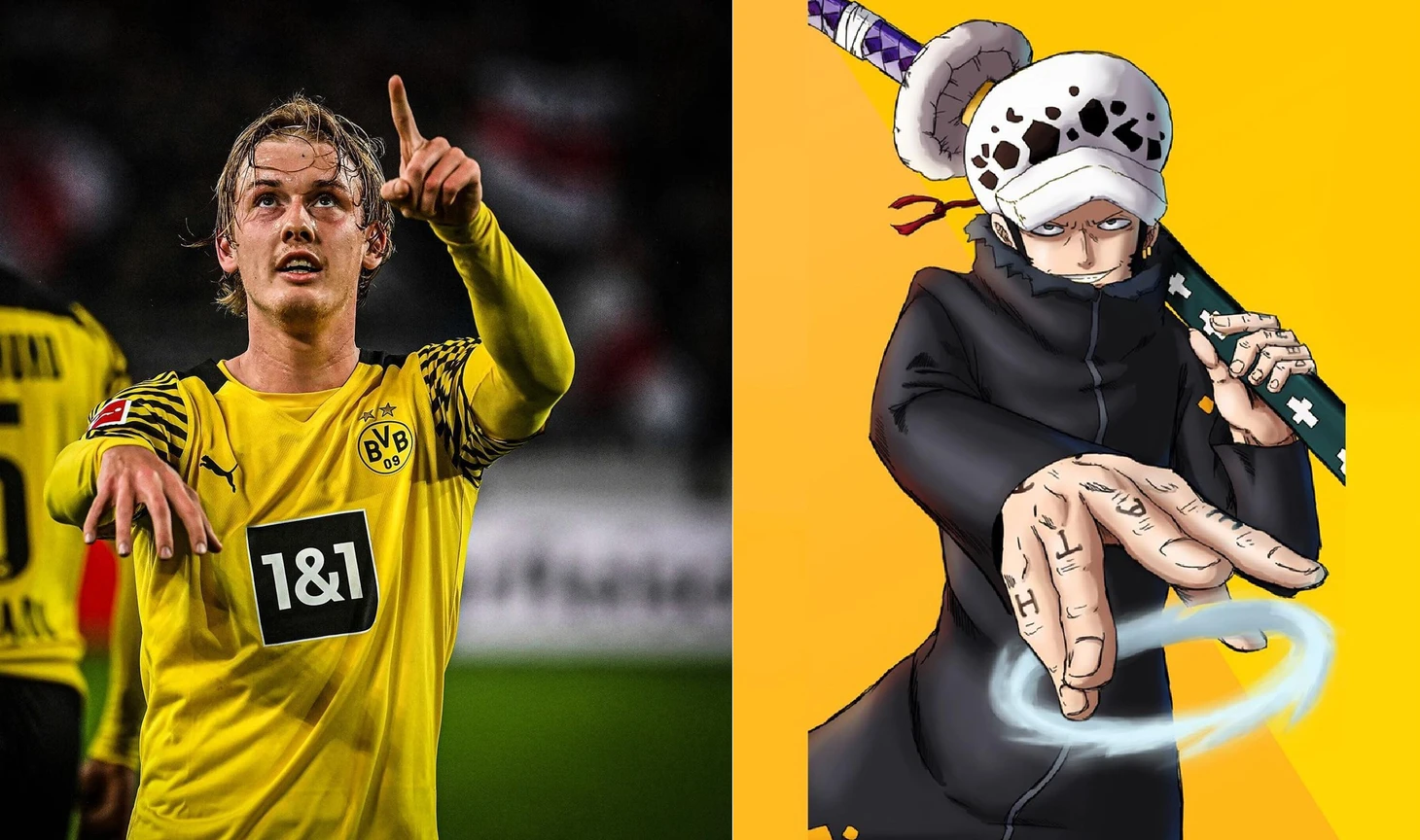 Забивая гол, Юлиан придал мячу необычную траекторию, в результате которой мяч немного вильнул перед вратарем и отчасти поэтому, тот не смог его отбить. Вероятно, этим празднованием Брандт ассоциирует себя с Трафальгаром Ло, ведь он тоже может менять траекторию предметов.