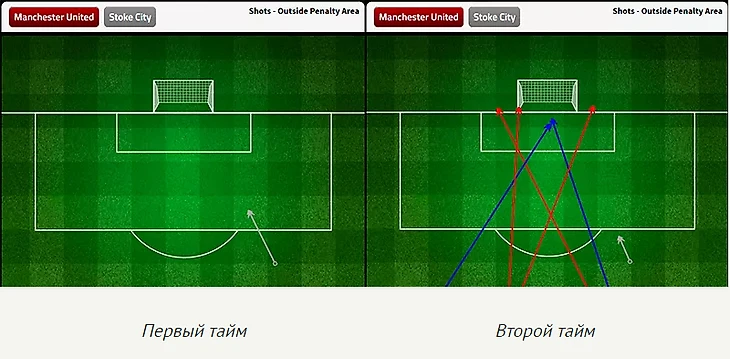 Несмотря на стартовую расслабленность, которая выразилась в нескольких ярких действиях Поля Погба и тщетных попытках Златана Ибрагимовича, со временем игроки «Стока» собрались и начали оказывать сопротивление. Быстрые прорывы «Юнайтед» через зияющие в центре поля дыры прекратились к получасу игры или чуть позже. Блок центральных полузащитников «Сток Сити» приспособился к игре полузащитников «Юнайтед» и перекрыл им кислород. Это можно увидеть и по усредненной позиции Андера Эрреры и Поля Погба, испанец больше тяготел к правому флангу, а француз – к левому, как и ранее в подобных матчах.