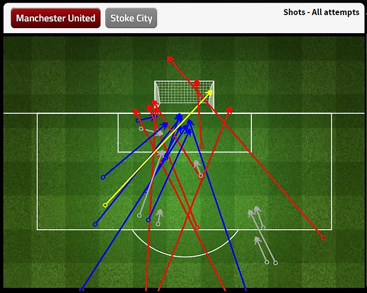 «Юнайтед» нанес 24 удара по воротам «Сток Сити», из них 9 – в створ ворот Ли Гранта (7 из пределов штрафной площадки), который с 8 сэйвами стал лучшим по этому показателю в этом сезоне (после удара Погба головой мяч попал в перекладину).