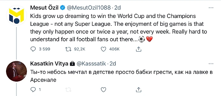 Мне лично очень жаль, что проект Суперлиги в футболе не состоялся. Я не хочу начинать очередную дискуссию о плюсах и минусах проекта, через пару часов после написания этого текста мне как раз предстоит такой разговор в подкасте «Cappuccino & Catenaccio» (выпуск выйдет 23 апреля).