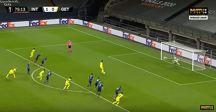 Игрок испанского клуба, Хорхе Молина, не забивает пенальти, но на повторе видно, что есть основания повторить удар еще раз, ведь сразу 5 игроков "нерадзурри" находятся в штрафной площади соперников. Сказать, что арбитр не заметил этого невозможно. Но пенальти перебить не дали.