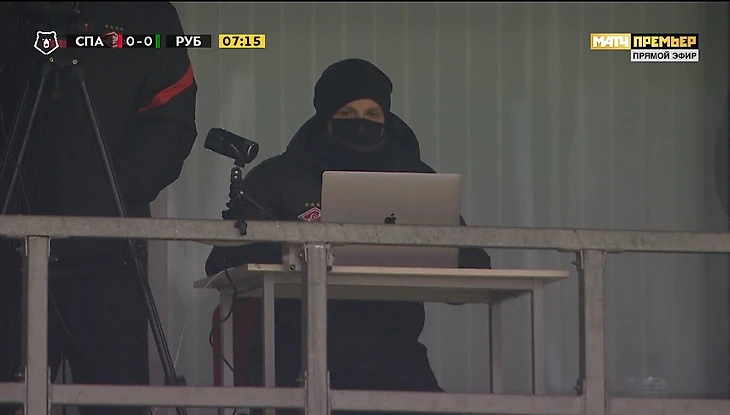 Довольно странно, что тренер отказался от такого предложения, учитывая, что такую возможность давали далеко не всем тренерам "Спартака", тем более, что немецкий специалист говорил, что не был бы против прихода на фанатский сектор. Справа от Тедеско стоит человек с камерой, которая явно снимает все поле с верхотуры "Открытие Арены", и получаемая в режиме реального времени картинка транслируется на ноутбук, от которого на протяжении всего матча не отходил тренер. Объяснение этому можно найти только одно: неуверенность. Наверняка, если бы Тедеско знал, что командное взаимодействие идеально, а его идеи работают на 100 процентов, тренер отправился бы на фанатский сектор и со спокойной совестью наблюдал за игрой его подопечных. Но вместо этого тренер смотрит матч один, попутно заглядывая в ноутбук, явно мониторя все тонкости игры команды.