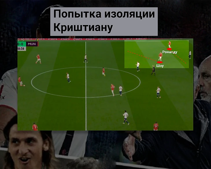Была попытка изолировать Криштиану (возможно импровизация игрококов): Шоу смещался в полуфланг, связывая этим движением КЗ и ЦЗ, после этого можно было переводить мяч на Роналду, чтобы тот продвинул мяч на дриблинге. Такой сюжет особо не повторялся, но в будущем, используя схему 5-3-2 (3-5-2), такой трюк может давать пользу против команд, которые отдают мяч, хотя по моему мнению Криштиану даёт больше преимуществ в штрафной соперника.