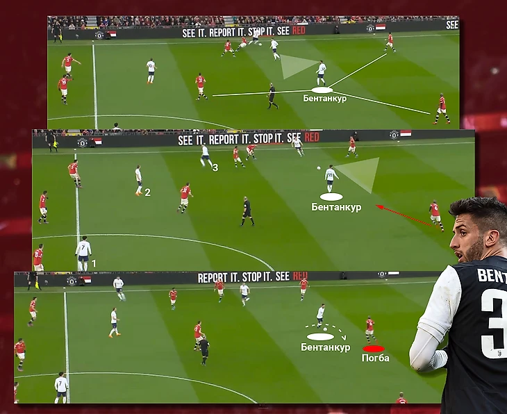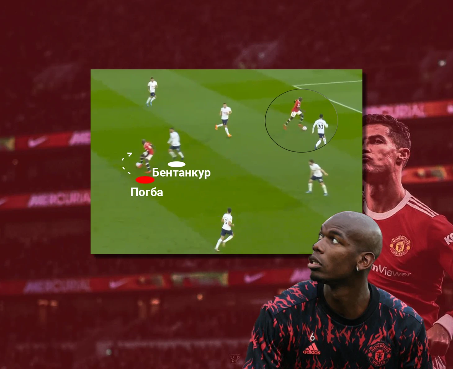 Здесь Родриго выбирает хорошую, равноудаленную от ближайших оппонентов позицию, анализирует ситуацию ( на скрине видно, что он успел посмотреть в обе стороны), но принимает максимально плохое решение. Он разворачивается через свое правое плече и 1) его уже готов накрывать Погба 2) Бентанкур упустил целых три возможных обостряющих передачи.