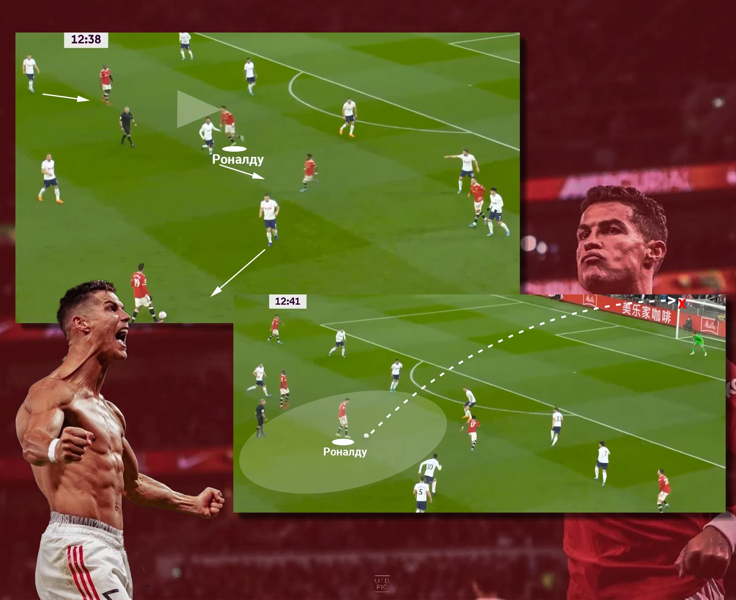 В эпизоде с первым голом португалец блестяще проанализировал ситуацию и выбрал позицию для удара. Погба,Фред и Варан заострили внимание полузащитников на себе, а центральные защитники не стали подниматься за Роналду. Удар. Гол.