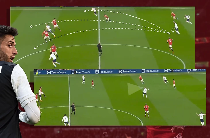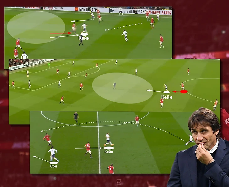 Создание "карманов" за счёт опусканий Кейна и забеганий Сона уже доказали свою состоятельность против Сити. Против МЮ Кейн открывался в центре,на флангах и полуфлангах. Своим опусканием он создавал свободное пространство у себя за спиной (при условии что защитник поднимается за Харри), а партнёры своевременно заполняли освободившееся место. Такой механизм ТТХ наиболее чаще встречался в матче и был довольно опасен для обороны Манчестера.