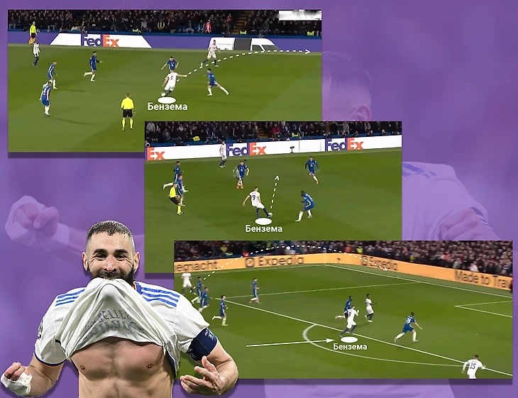 В матче против Челси Карим отлично показал себя во всех четырёх компонентах: Здесь Бензема сместился в полуфланг и немного вглубь поля, выдернув одного из защитников, затем пяткой скинул мяч на Модрича и сразу же рванул в штрафную соперника. Через несколько секунд он уже мог забивать гол.