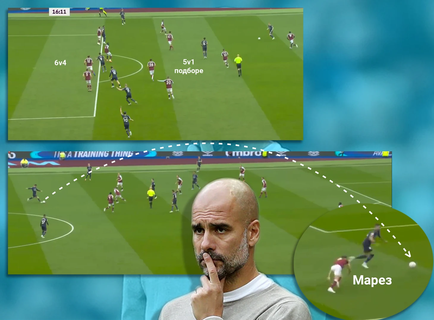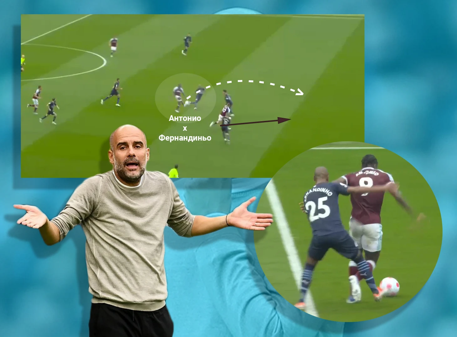 В основном составе Сити парой центральных защитников были Эмерик Ляпорт и Фернандиньо - бразилец является полузащитником, и в центре он выходил редко. Нападающий молотобойцев, Майкл Антонио, выбрал оппонента по-слабее, он провоцировал именно Ферну выдвигаться за ним и идти в борьбу. Все выносы и вериткальные передачи шли именно в зону бразильца, где раз за разом он оказывался проигравшим.