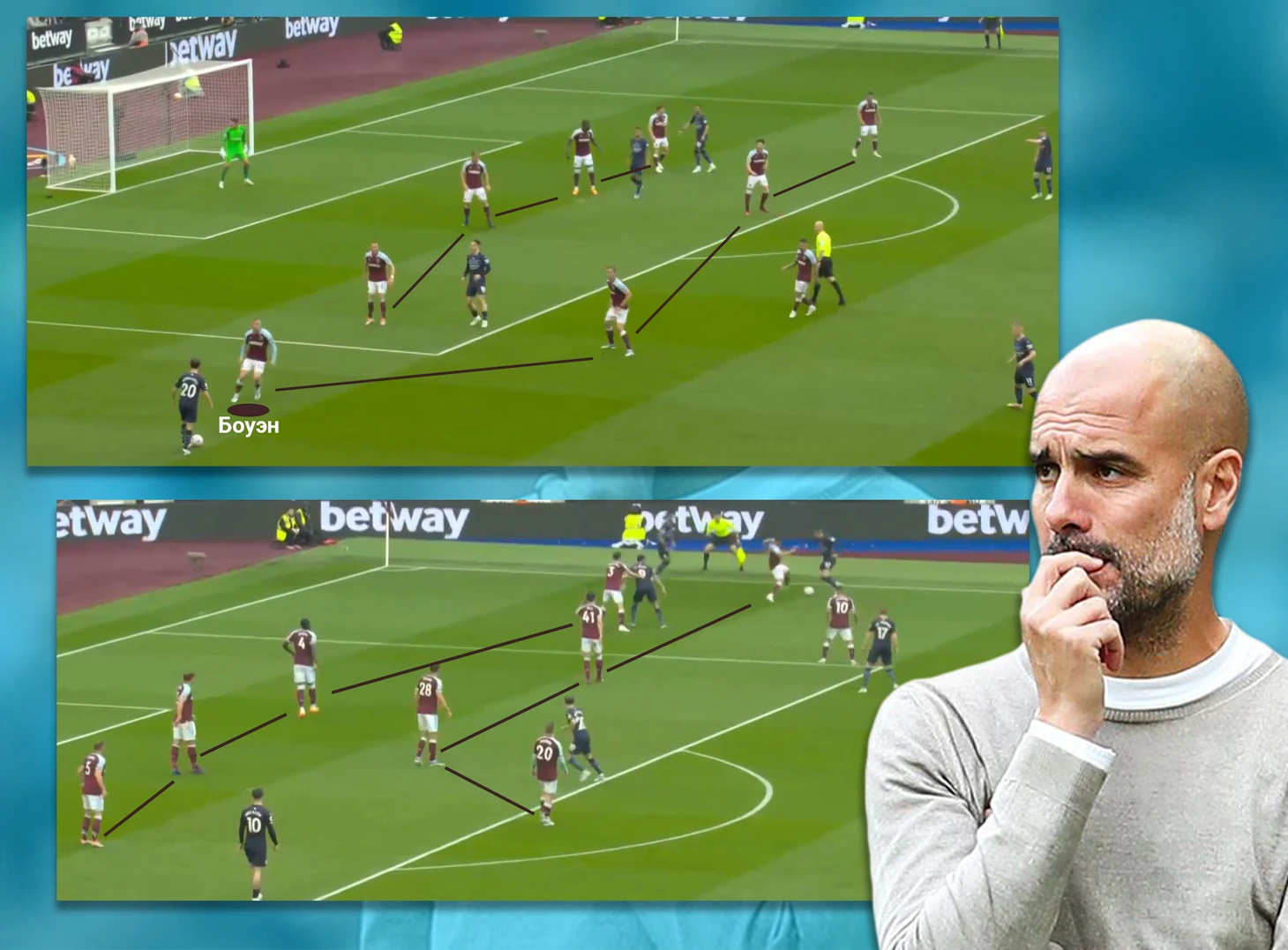 Против Вест Хэма МС злоупотребляли перегрузами. В последней линии их преимущество доходило до 6v4, при этом в зоне подбора оставался один Родри(+-Де Брюйне) против 5 человек в бордовой форме. Это и позволяло Боуэну убегать в контратаки. Но кое-что ещё помогало Джарроду забивать голы и создавать голевые моменты.