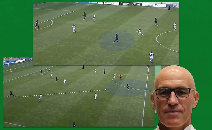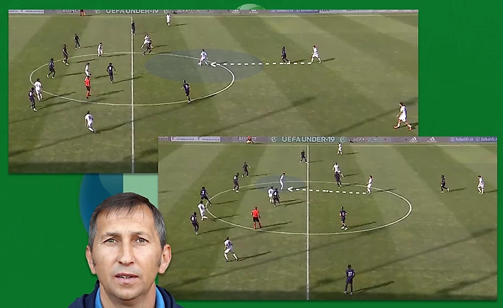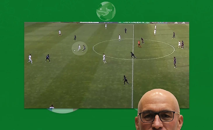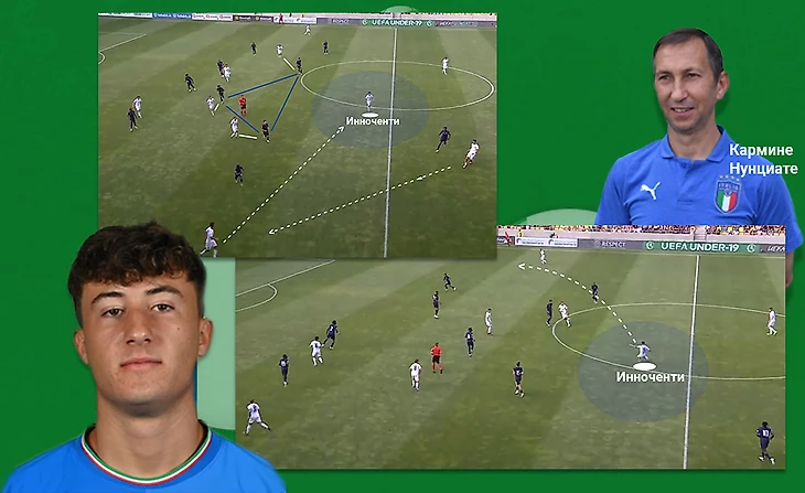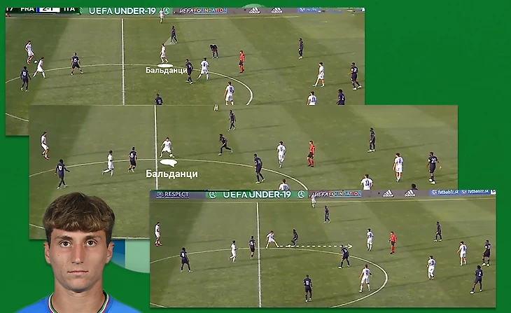 В составе Скуадро Адзурры хочется выделить десятку, многим напоминающим Папу Гомеса. Несмотря на то что франзуцы не давали продвигать мяч через опорного полузащитника, Томаззо Бальданци находил лайзейки в центре. Опускаясь он сканировал пространство у себя за спиной - это помогало в нужную сторону обработать мяч, закрывая его корпусом от соперника. Обратите внимание: обработав мяч левой ногой, в целях экономии времени Томаззо этой же ногой и отдал проникающую передачу, как бы соеденив воедино технические элементы. Такое действие послужило началом опасного момента у ворот Франции. Очень рационально и эффектно!