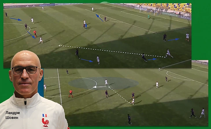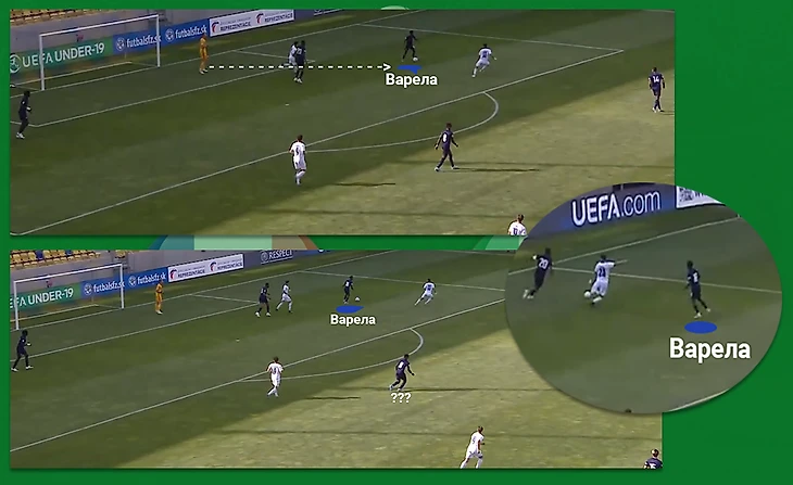 Под высоким прессингом вскрылись некоторые индивидуальные недостатки игроков Франции. Крайний защитник Жордан Варела классно обработал передачу от вратаря, развернув корпус так, что перед ним была открыта линия паса в центр, где открылся Бондо. Но под давлением защитник решил перестраховаться и закрыть мяч спиной от нападющего Италии, что спровоцировало его отдать передачу назад и в итоге потерять мяч.