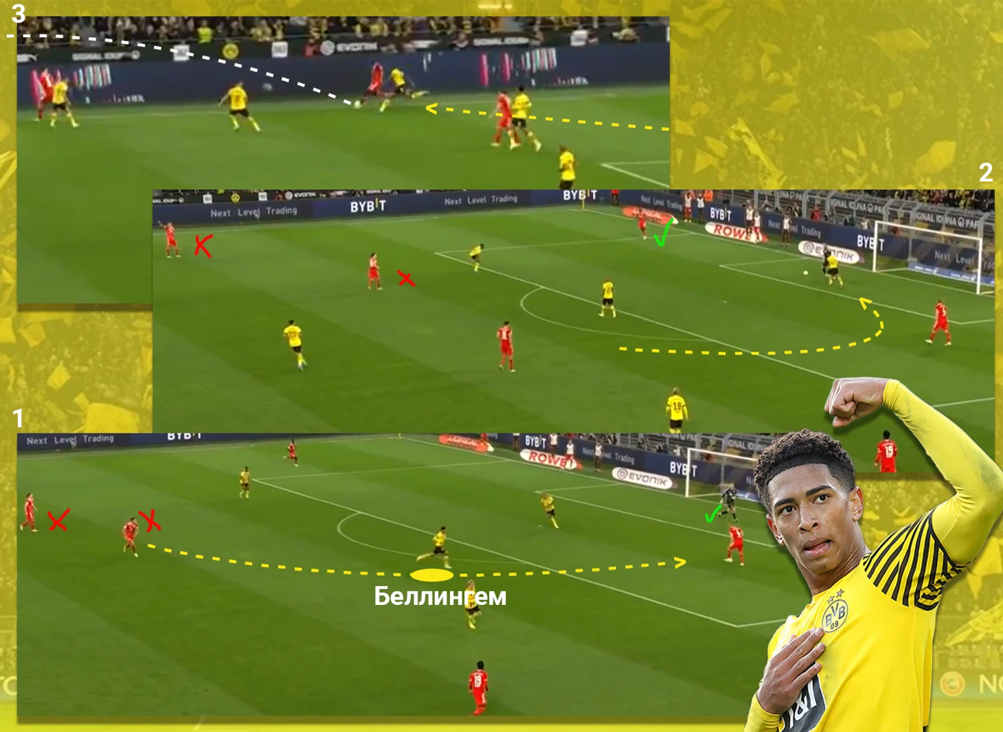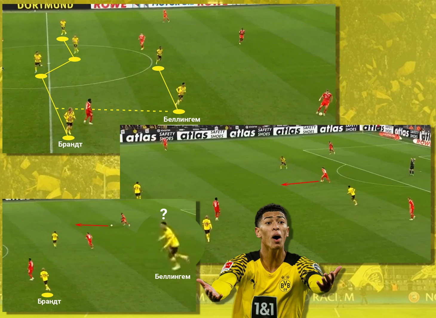 Проблемы у Дортмунда возникали тогда, когда им нужно было перейти от среднего оборонительного блока к прессингу. Средний блок выглядел как 4-5-1, где Беллингем иногда выдвигался на одну линию к форварду, а Юлиан Брандт занимал позицию на правом фланге. Передача игроков Баварии назад была неким триггером для прессинга Боруссии, и когда эта передача находила Нойера, вдруг первоначально заготовленный прессинг-план не накладывался на такие обстоятельства. На скриншоте снизу видно реакцию Джуда, и кажется претензии англичанина направлены на Юлиана, а может и на Терзича)