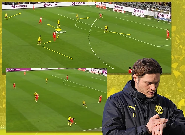 В матче против Баварии у Дортмунда был довольно хороший прессинг-план, когда Нойер разыгрывал от ворот коротким пасом. Юлиан Брандт располагался под двумя нападающими, которые играли по центральным защитникам, и оказывал давление на одного из опорников, второго опорника брал на себя Джуд Беллингем, а один из флангов контролировал Озджан. Когда мяч оказывался у свободного Дэвиса к нему смещался Беллингем, а Брандт к полузащитнику которого оставил Джуд. Всё выглядит логично, интересно и это даже работало. Но есть небольшая загвоздка.
