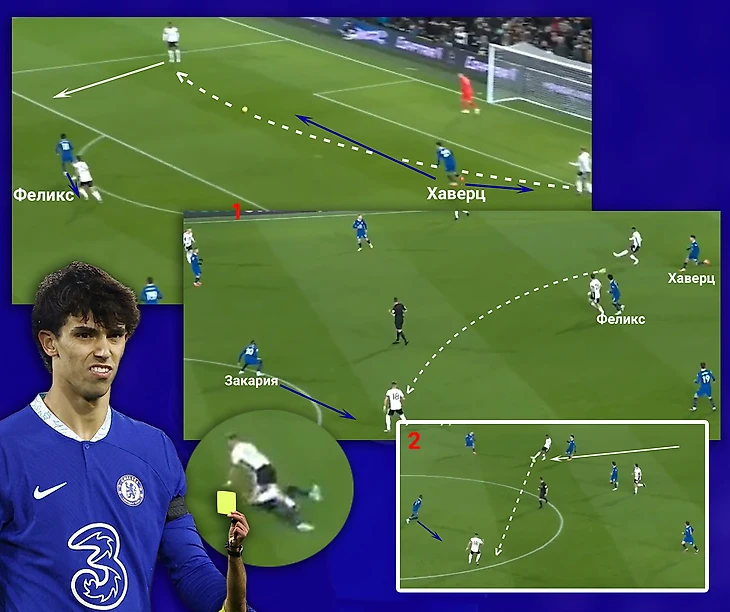 Прессинг Важно отметить роль Феликса в прессинге Челси. Атакующая тройка выстраивалась в треугольник вершиной (Хаверц) вверх, где нападающий играл по двум центральным защитникам. Жоау ориентировался на опорника, поэтому не выдергивался на защитника, получившего пространство. Следствием такого прессинг-плана Поттера становилось систематическое продвижение мяча Фулхэмом за счёт дриблинга ЦЗшников. Из-за недостатка инструкций возникали большие расстояния между игроками. Так ,например, Закарии пришлось фолить при неудачном давлении Хаверца. В излишней грубости игроков Челси можно винить и самого Грэма Поттера. Такой аргумент хоть немного оправдывает красную карточку Феликса))