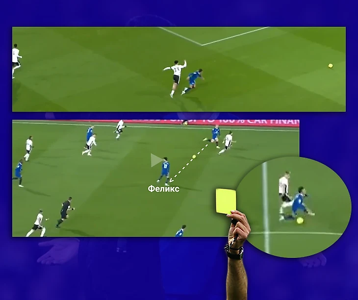 В ситуациях, когда соперник сзади, важно своевременно сканировать пространство и определять на каком расстоянии он от тебя находится. За счёт такого скилла Феликс посадил на желтую карточку Перейру. А ещё, выиграв в скоростной дуэли, заставил сфолить на себе Робинсона, который тоже получил жк.