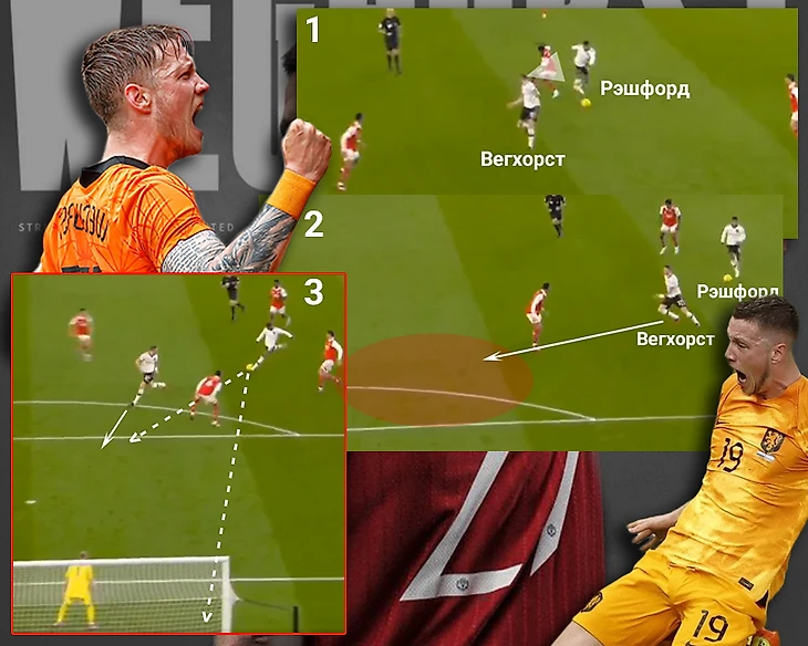 С Арсеналом Вегхорсту пришлось покрутить головой, чтобы убедиться, что Рэшфорд обыграл Парти, а затем увидеть свободную зону и вбежать в неё. За счет такого сканирования нападающий 1-создал коридор для передачи от Рэшфорда, 2-открыл ближний угол ворот для удара напарника. Маркус выбрал второй вариант и дальним ударом забил гол
