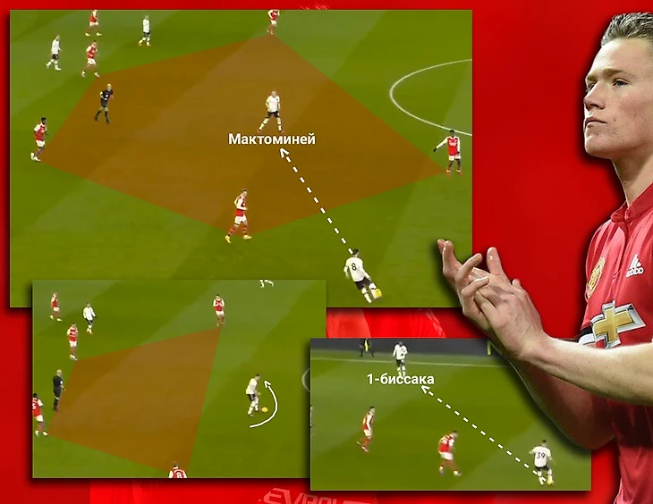 Что касается решений, то пример можете увидеть на первой картинке ниже. Имея пространство впереди и в последствии получая возможность отдать передачу ближе к штрафной, Скотт, принимая передачу, разворачивается спиной к свободной зоне, из-за чего следующий пас пойдет поперек поля. Такие трусливые решения можно часто наблюдать в игре шотландца, что конечно же бьёт по атакующей мощи Юнайтед