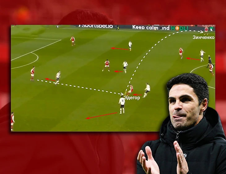 План Артеты против прессинга МЮ Отличительная характеристика прессинга МЮ Тен Хага заключается в том, что игроки заставляют соперников отдавать передачу на бровку, при этом на другой стороне они умышленно оставляют свободного игрока, чтобы иметь численное преимущество в зоне, которая находится ближе к мячу. Артета прекрасно подготовился к давлению МЮ. Идея преодоления манчестерского прессинга заключалась в следующем: Когда мяч находился у центрального защитника Арсенала (чаще у Салиба) Мартин Эдегор делал рывок из глубины и после получения мяча первым же касанием переводил его на фланг Зинченко. На картинке видно, что «красные дьяволы» разобрали всех кроме Александра.