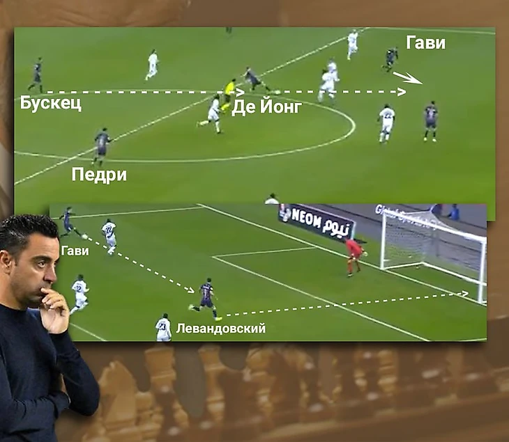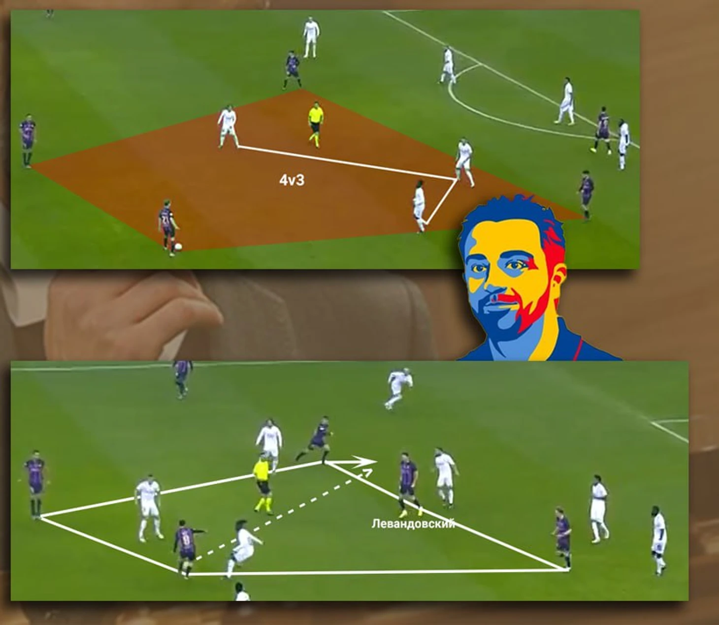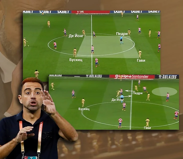 Эксперименты Хави с квадратом в центре поля начались в матче против Атлетико Мадрид. В распоряжении испанского тренера не было чистого центрфорварда, поэтому на его позиции вышел Ансу Фати. Правда его расположение было хаотичным, он мог часто смещаться на фланг и на другие позиции, заменяя кого-то из четырех полузащитников: Бускеца, Де Йонга, Педри или Гави (в основном Педри и Гави). В рамках четырехугольника игроки Барсы ротировали свои позиции, дабы создавать пространство за спинами игроков. На картинке снизу позициями поменялись Де Йонг и Педри. Как видно, за спиной защитников образовалась свободная зона.