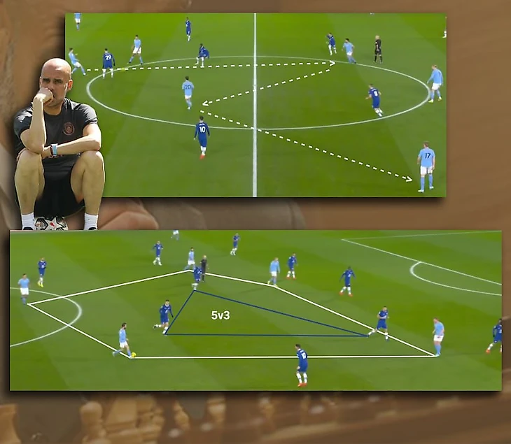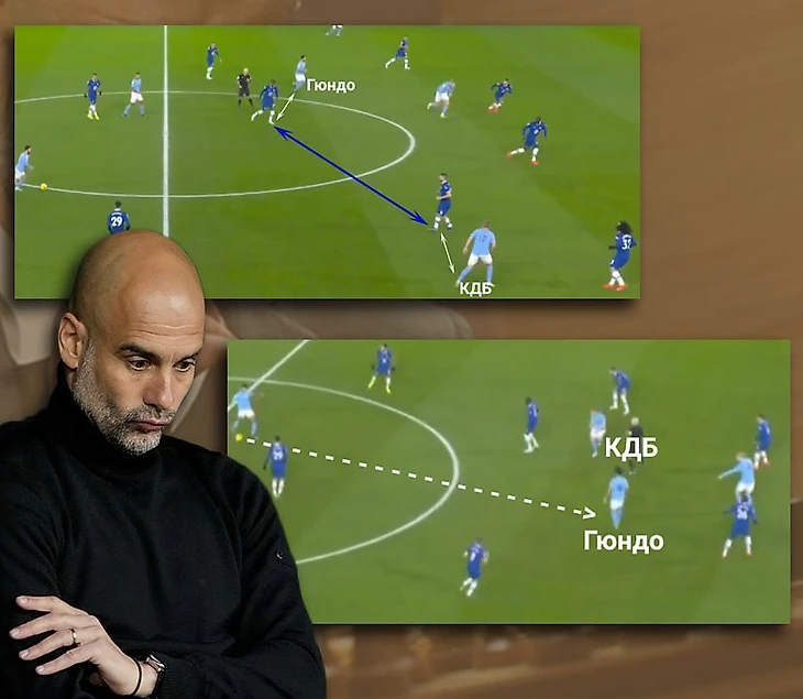 Ещё один функционал квадрата заключается в подвижности его верхних углов - Де Брюйне и Гюндогана. Их движение могло создавать как коридор для передачи на нападающего, так и перегружать опорную зону Челси. После одного из перегрузов Гюндоган создаст для Эрлинга голевую ситуацию.
