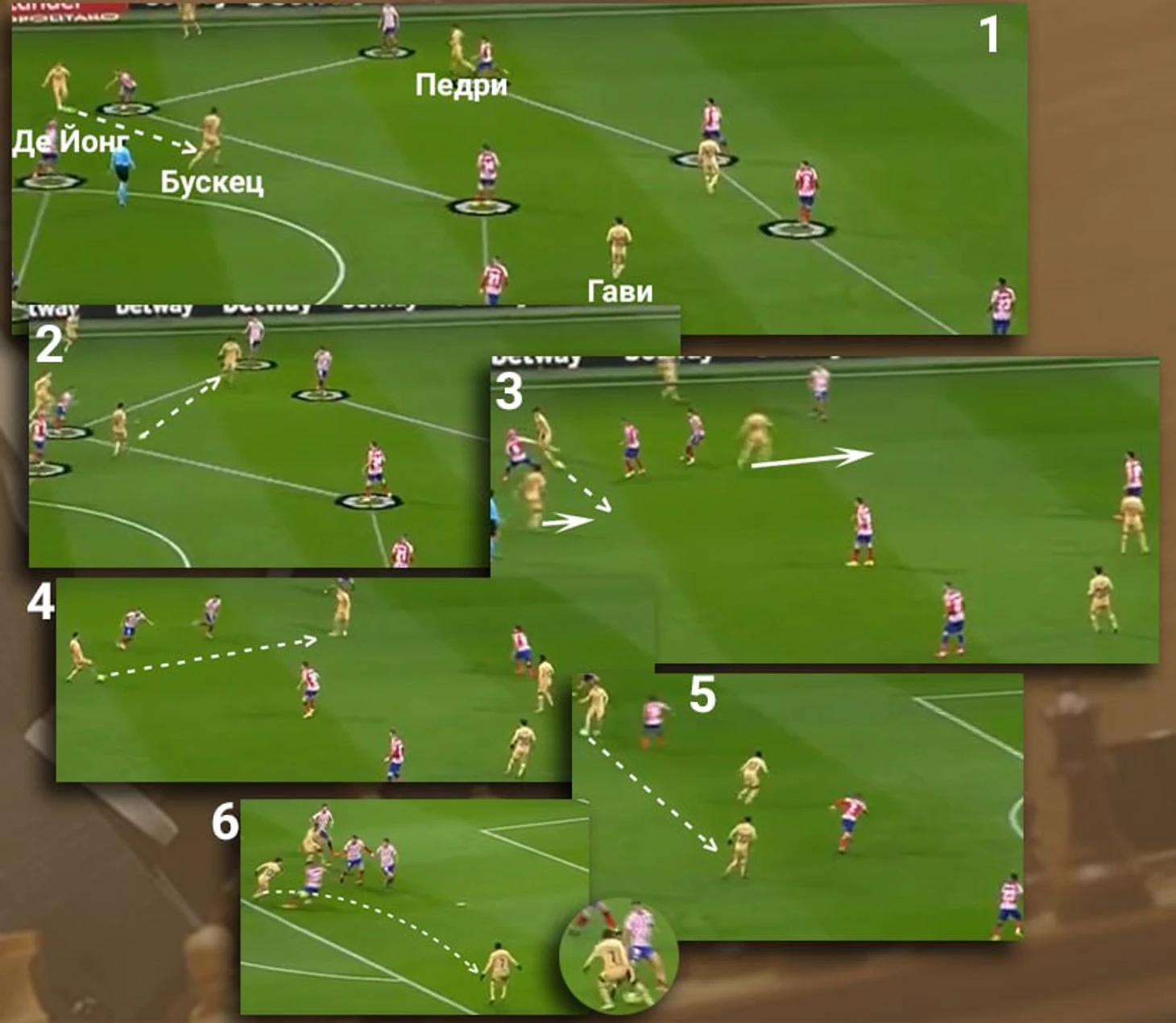 Важно отметить, что в этом матче Хави, как и Гвардиола, отошел от своих канонов. Излюбленный прием Барсы - это изоляция Дембеле. В этом же матче акцент делался на проход через центр, с помощью его перегруза. Благодаря такой структуре Барселоне удалось создать чуть ли не идеальную комбинацию, не хватило акцентированного удара и гола. Начиная с центра поля, сине-гранатовые довели мяч до свободного Дембеле транзитом через каждого игрока четырехугольника! На картинке постарался показать, как проходили взаимодействия.