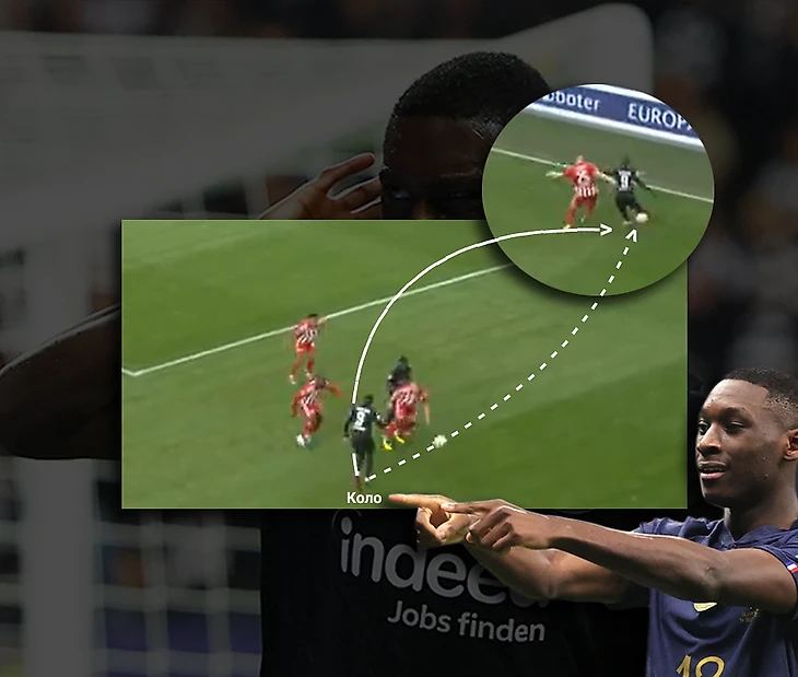 Прокинув мяч вперед, надеясь на забегание партнера, Коло мгновенно прочитал ситуацию. Француз понял, что ни соперники ни партнер не отреагировали на его действие, поэтому Рандаль сам по дуге догнал мяч и прострелил в штрафную