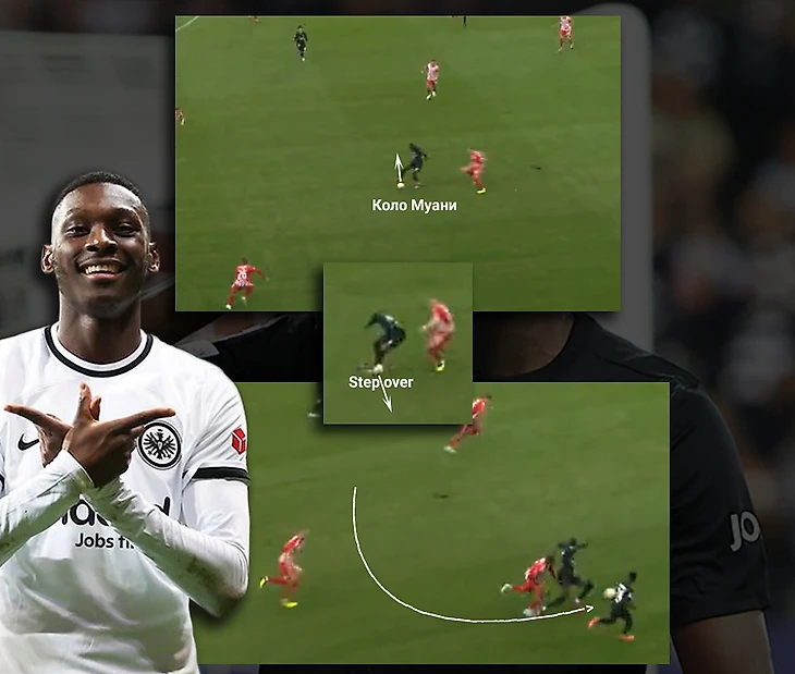 В эпизоде на картинке Коло классно качнул защитника. Сначала нападающий показал, что будет разворачиваться через правое плечо, а потом сделал финт "step over" (любит использовать Роналду), убрав мяч влево от себя. Муани протащил мяч по дуге, после чего сопернику пришлось фолить на французе: