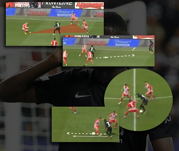 Рандаль продемонстрировал довольно внушительный арсенал скиллов для обводки соперников. Чаще всего француз встречался с мячом, находясь спиной к сопернику. Он эффективно укрывал мяч корпусом, а за счёт длинных ног удерживал его вне зоны досягаемости защитника. В данной ситуации мало не дать добраться до мяча сопернику, нападающему желательно развернуться и разогнать атаку.