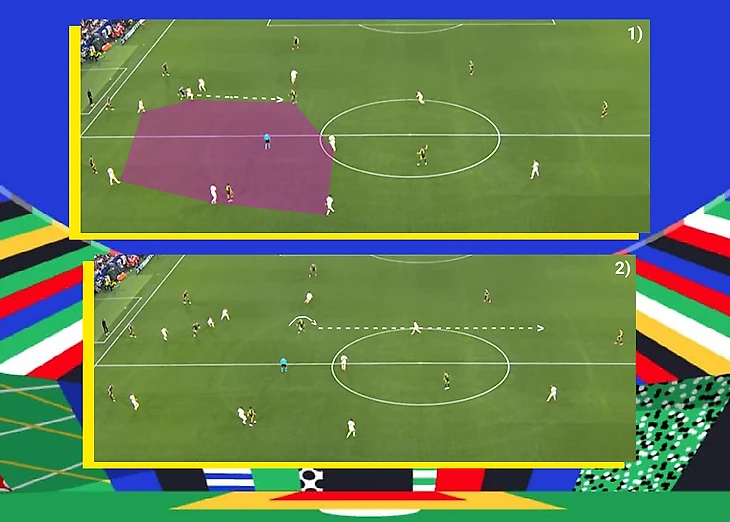 После переводов Крооса Илкай делал рывки в штрафную, чтобы освободить зону за спиной и предложить себя под подачу/прострел. После первой попытки таких махинаций Шотландия сохраняла плотные построения в обороне. Но вторая закончилась голом: сужение игрока в правом полуфланге открыло Киммиха, а забегание Гюндогана освободило «золотую» зону для удара (зона 14) Вирца