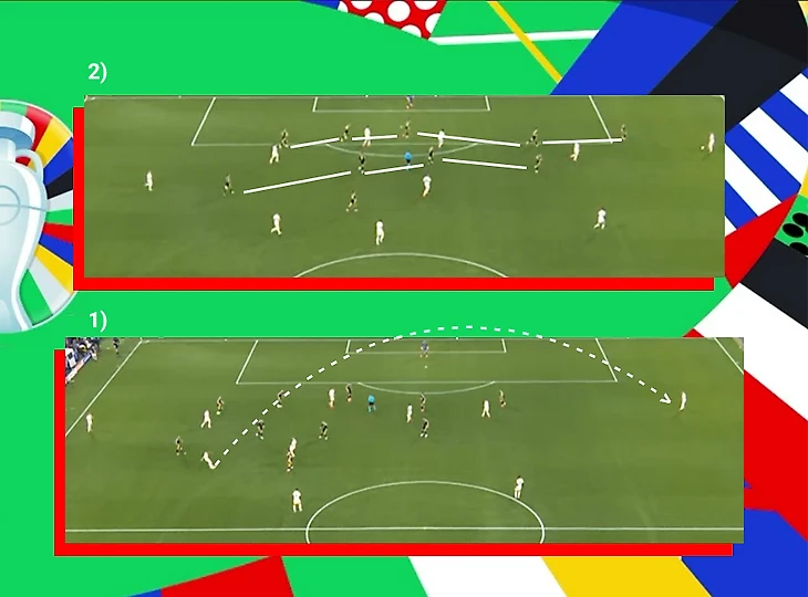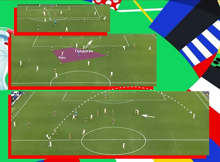 Три десятки сборной Германии, о которых рассказывал здесь, позволили перегрузить центральную зону и собрать на себе внимание нескольких шотландцев. Два партнера Илкая «связали» четырех оппонентов, что выиграло несколько секунд для этого самого приема